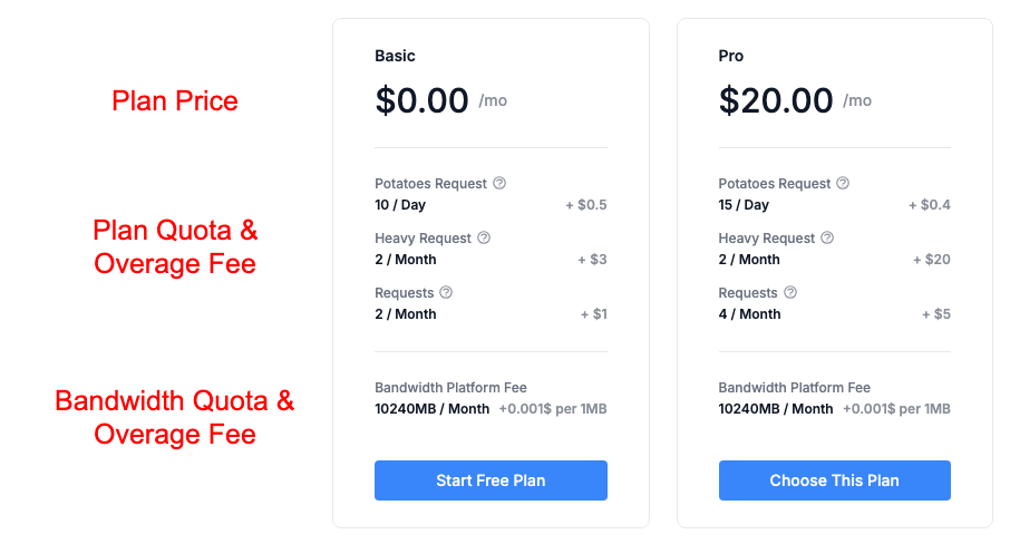 If the API has pricing associated with it, you will need to select a pricing plan before calling the API. Prices are based on a recurring monthly subscription based on the plan selected — plus overage fees applied if you exceed a plan’s quota limits.